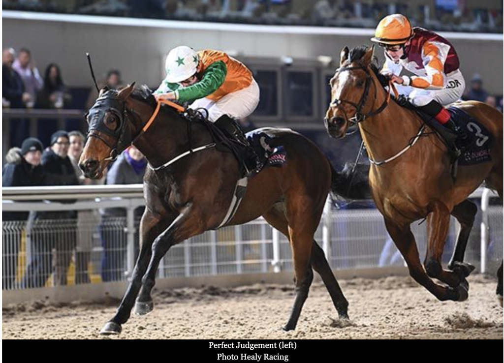Thorne had landed the previous contest with Volatile Analyst partly owned by Perfect Judgement’s owners Shamrock Thoroughbreds, while Powell had earlier denied Thorne a treble on the evening when scoring on Ado McGuinness‘ Exquisite Acclaim at the expense of Hightimeyouwon in the 7f rated race.